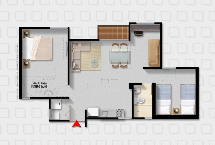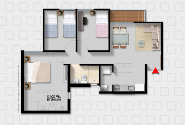 El apartamento de 56 m2, tiene la distribución tradicional y cuenta con 2 habitaciones y un estudio, 1 baño con opción de instalación de un segundo baño, sala-comedor con balcón, cocina y área de labores.
